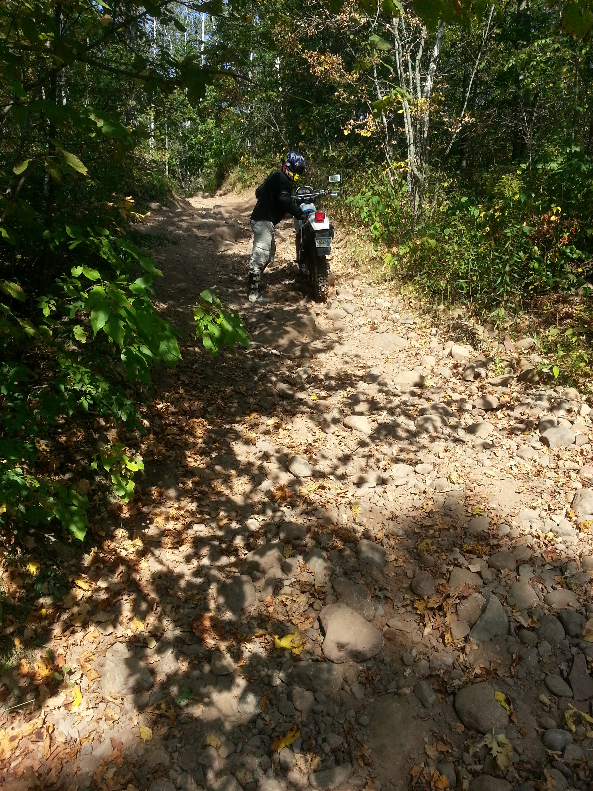 Just a quick ride report from this last Sunday in the Chengwatana State Forest. If you haven’t been to this area before it is a small state OHM and ATV trail system, but one of the closest to the Twin Cities area. I had my son in tow riding a DR250. It was his first time on a real trail and he had a great time. The photo below shows him trying to get up the only hill climb on this trail which can be pretty gnarly. The rocks in the photo are not limited to this hill. Almost the entire trail has good sized rocks and ruts.