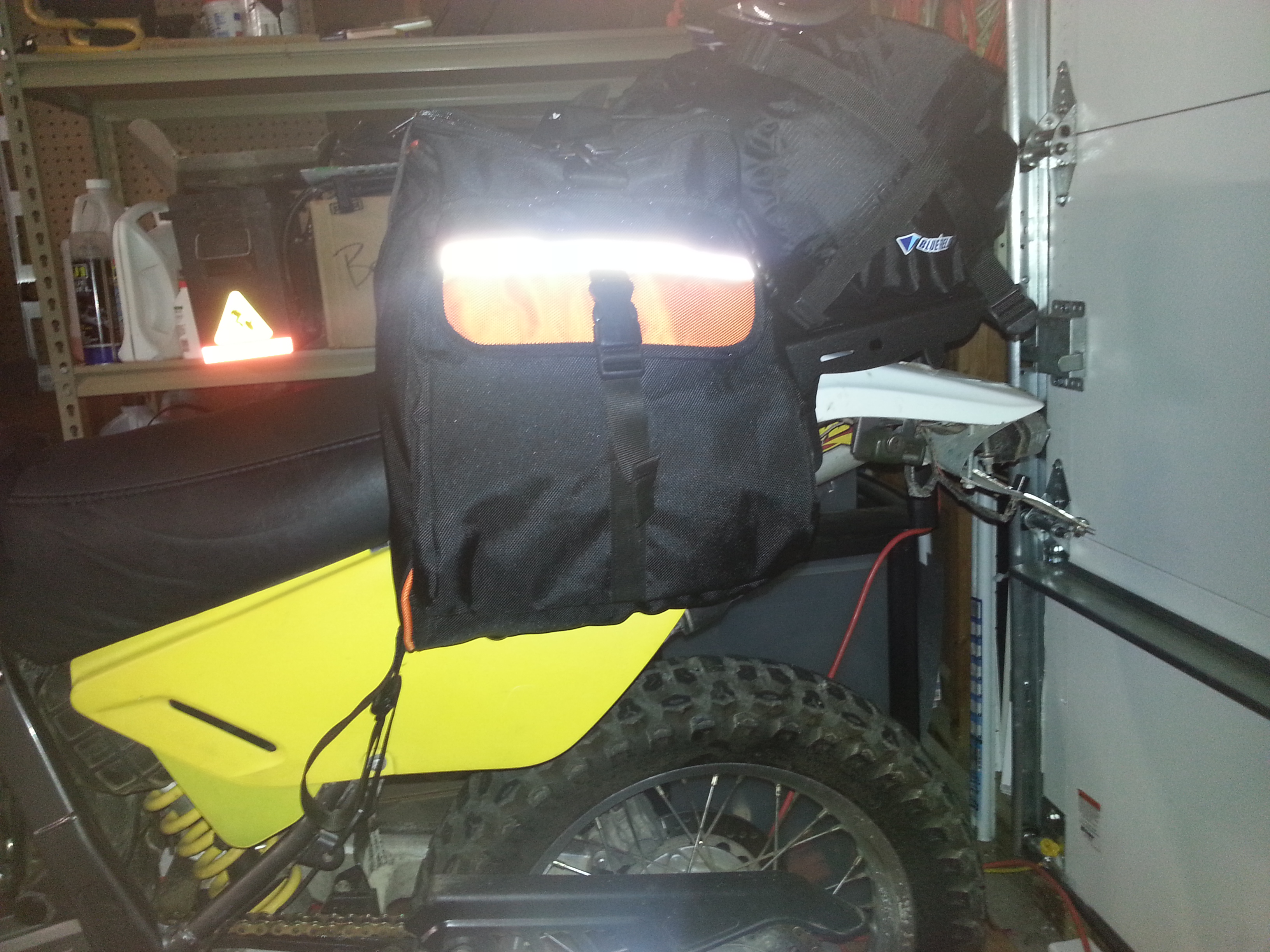 The opportunity came on my 3 day trip to Canada last Fall. It turned out to be a great choice. That ride was rocky and bumpy, but the Claw held up to its name staying mounted just where I put it. My tent, sleeping mat, food, and cooking supplies all fit neatly inside. Only my cold weather sleeping bag was attached outside the Claw to the rear. Although the Claw came with a waterproof cover I decided to spray it down with 3M waterproofing instead to save the space the cover took up. The Claw comes with strapping, but I choose to use Rok Straps attached to the Claw’s d-rings instead. The front straps went to my rear foot peg mounts and the rear went round my tail rack. It worked well. Everything stayed dry even though we experienced a heavy rainfall and frost. I imagine with the myriad of strapping options the bag provides it could be mounted to many different bike models.