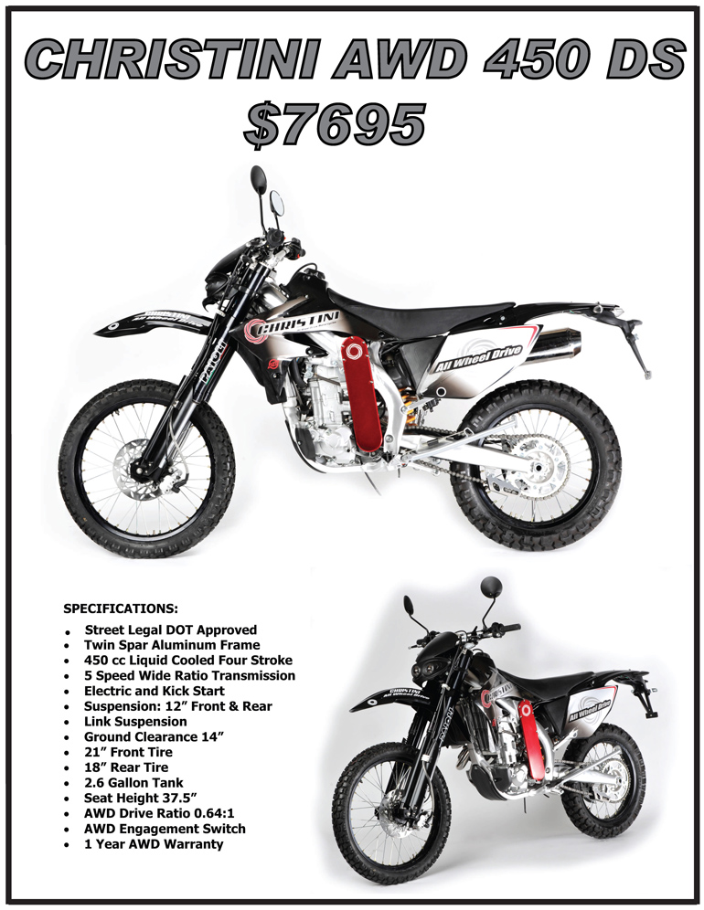 May 1, 2012If you are familiar with Christini you know they have been making aftermarket conversion kits for dirt bikes that enable limited slip drive of the front wheel. Pretty cool products and well loved by those who want somewhat of an exotic conversion to get them over steep hills, rocks, etc. However, I just heard that they will be producing a complete DS bike this year. Rumor also has it that it is based on a CRF450 engine. So this could be a very sweet DS setup for some folks. Not sure what local shops might carry it. Sound off in the comments if you know of any Minnesota Christini distributors. (http://www.christini.com/)
